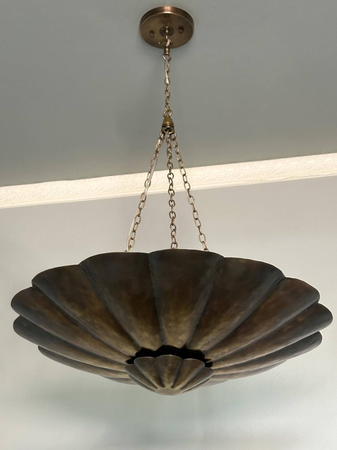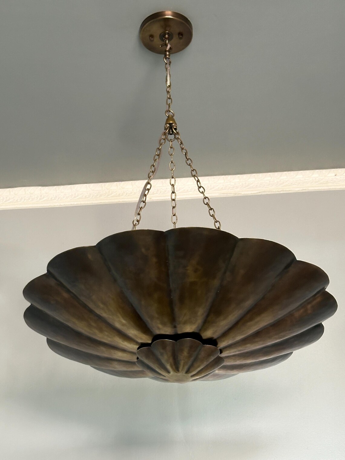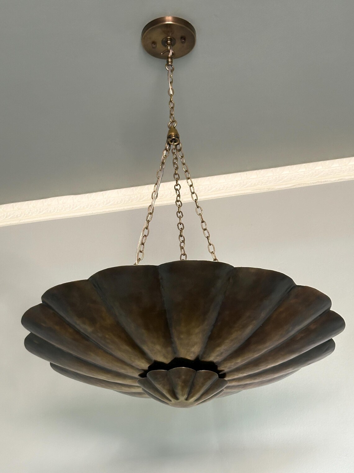 Make a bold statement in your home with this handcrafted brass chandelier pendant light, featuring a stunning scalloped bowl-shaped design suspended by three elegant chains. This sophisticated fixture brings a perfect blend of vintage charm and modern craftsmanship, ideal for high-ceiling spaces like entryways, dining rooms, or living areas.