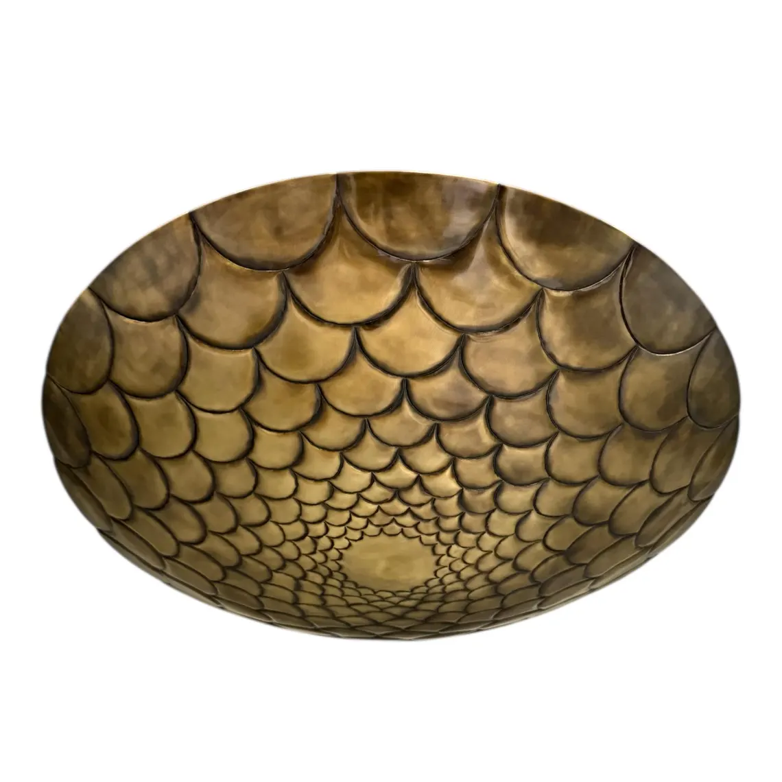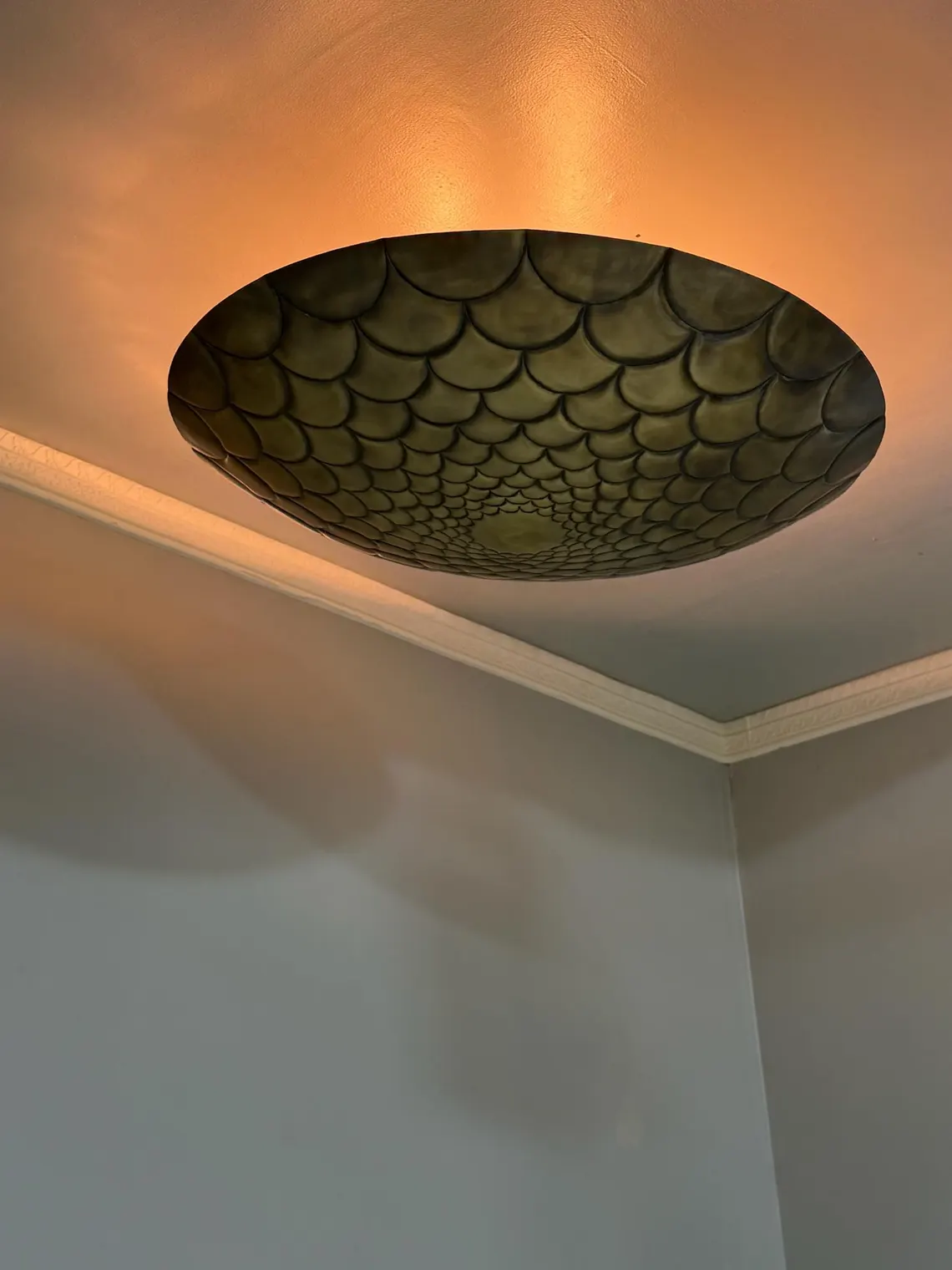 Bring warm elegance and sculptural charm to your space with this stunning brass flush-mount ceiling light. The dome-shaped fixture features a beautifully hand-finished fish-scale (scalloped) pattern, giving it a luxurious texture reminiscent of Art Deco and modern organic design.