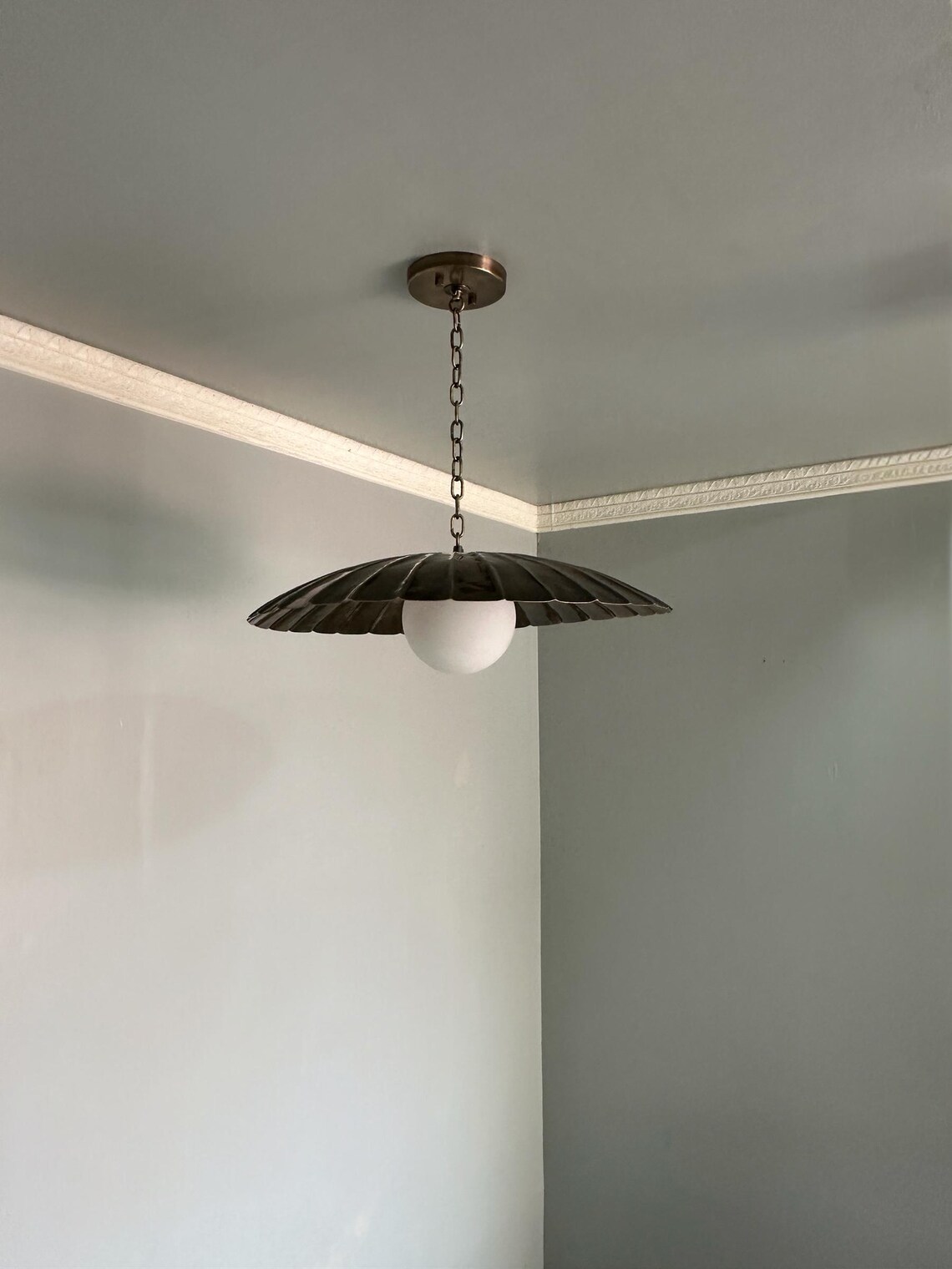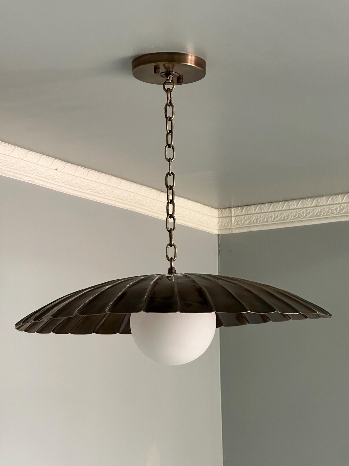 Add timeless elegance to your space with this beautifully crafted brass flush mount ceiling light. Featuring a unique scalloped design and warm antique brass finish, this fixture perfectly blends vintage charm with modern sophistication. The adjustable chain allows versatile installation as a semi-flush or pendant light, while the smooth milk glass globe softly diffuses light for a cozy, inviting glow.