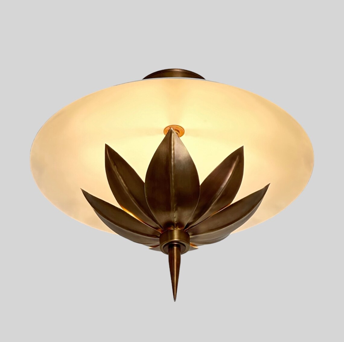 Add a touch of antique charm to your space with this handmade Lotus Antique Style Pure Raw Brass Flush Mount. Crafted with care and attention to detail, this flush mount features a beautiful lotus design that adds a hint of elegance to any room. Made from high-quality pure raw brass, this unique piece exudes a timeless appeal and will surely become a focal point in your home decor. Elevate your space with this exquisite flush mount that effortlessly combines vintage aesthetics with modern craftsmanship.