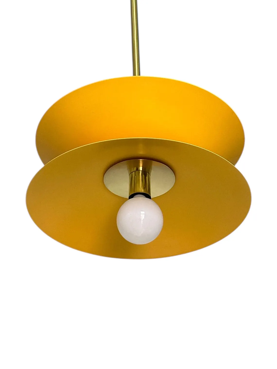 Illuminate your space with this striking handcrafted pendant light, featuring a sleek combination of brass and Matte Mustard metal. Designed with a modern, sculptural form, the layered disc design not only diffuses light beautifully but also serves as a bold artistic statement. Perfect for kitchens, dining areas, entryways, or creative interiors, this pendant fixture brings warmth, style, and a touch of mid-century inspiration to any room. Made with premium materials and meticulous craftsmanship.