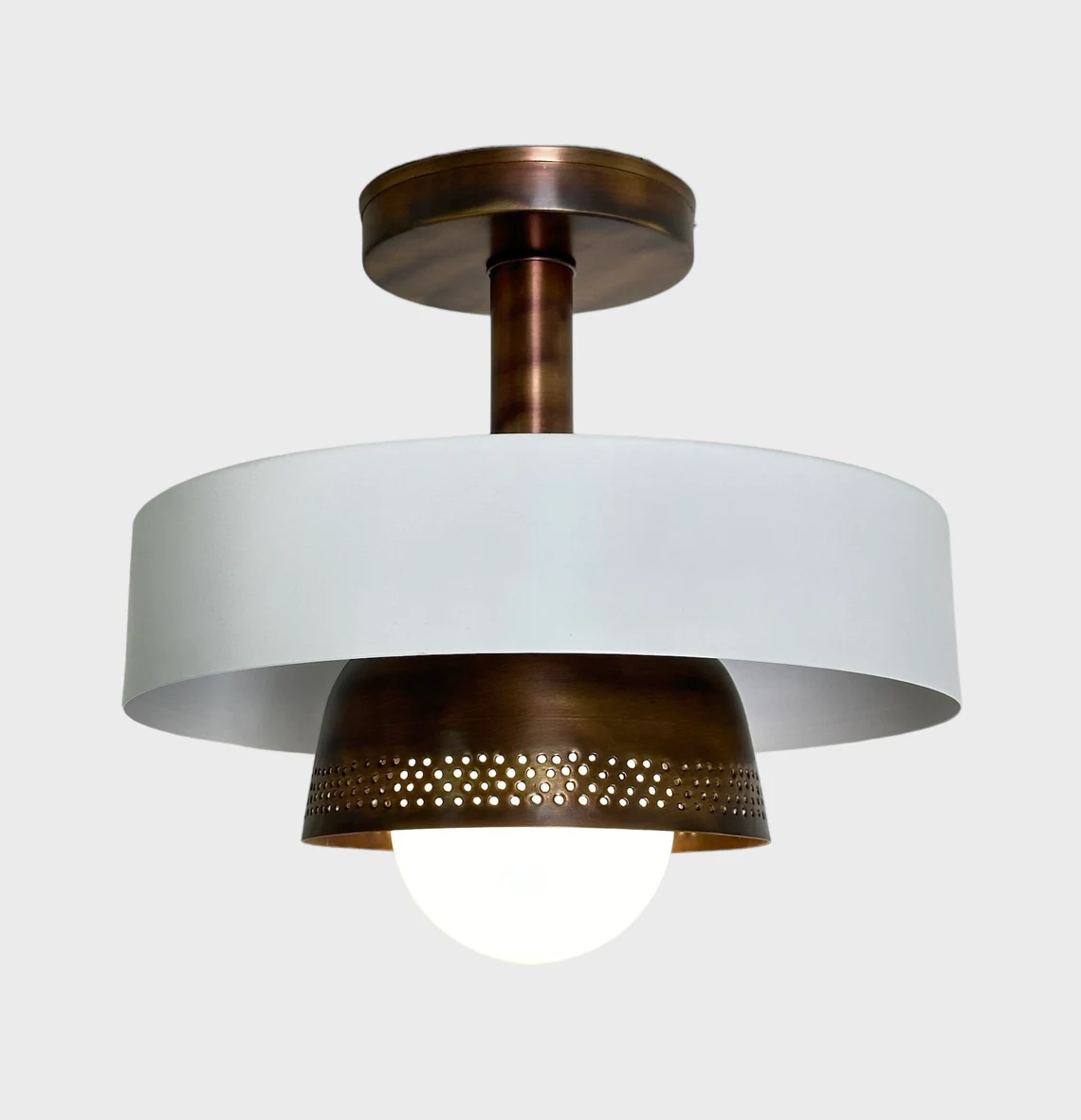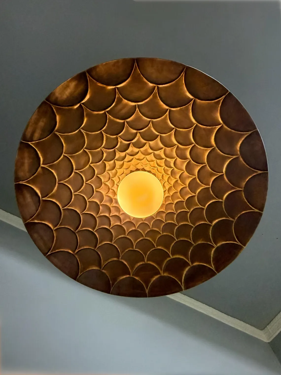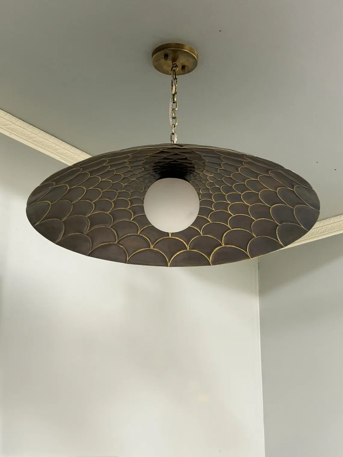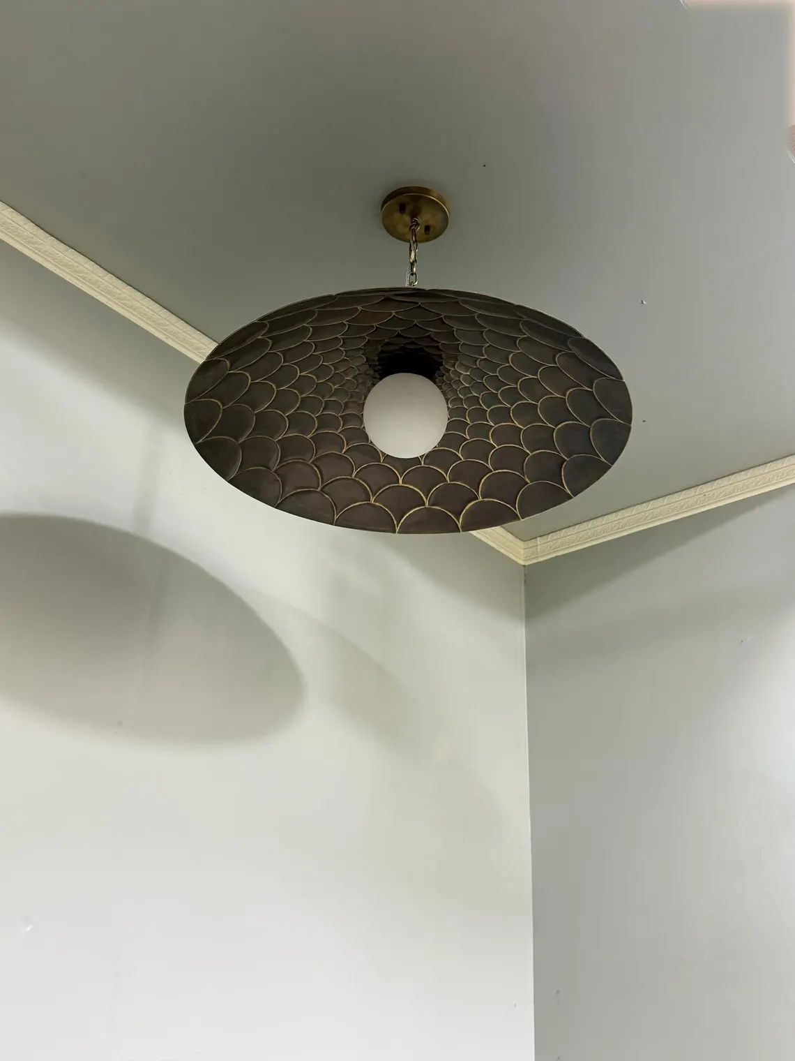 Bring artistic texture and warm metallic elegance to your space with this fish-scale style brass ceiling light. Designed with a wide, gently curved dome shade, this fixture features a repeating scale pattern that creates beautiful depth and visual movement. The antique-brass finish gives it a rich, timeless character, while the central globe diffuser provides soft, even illumination.