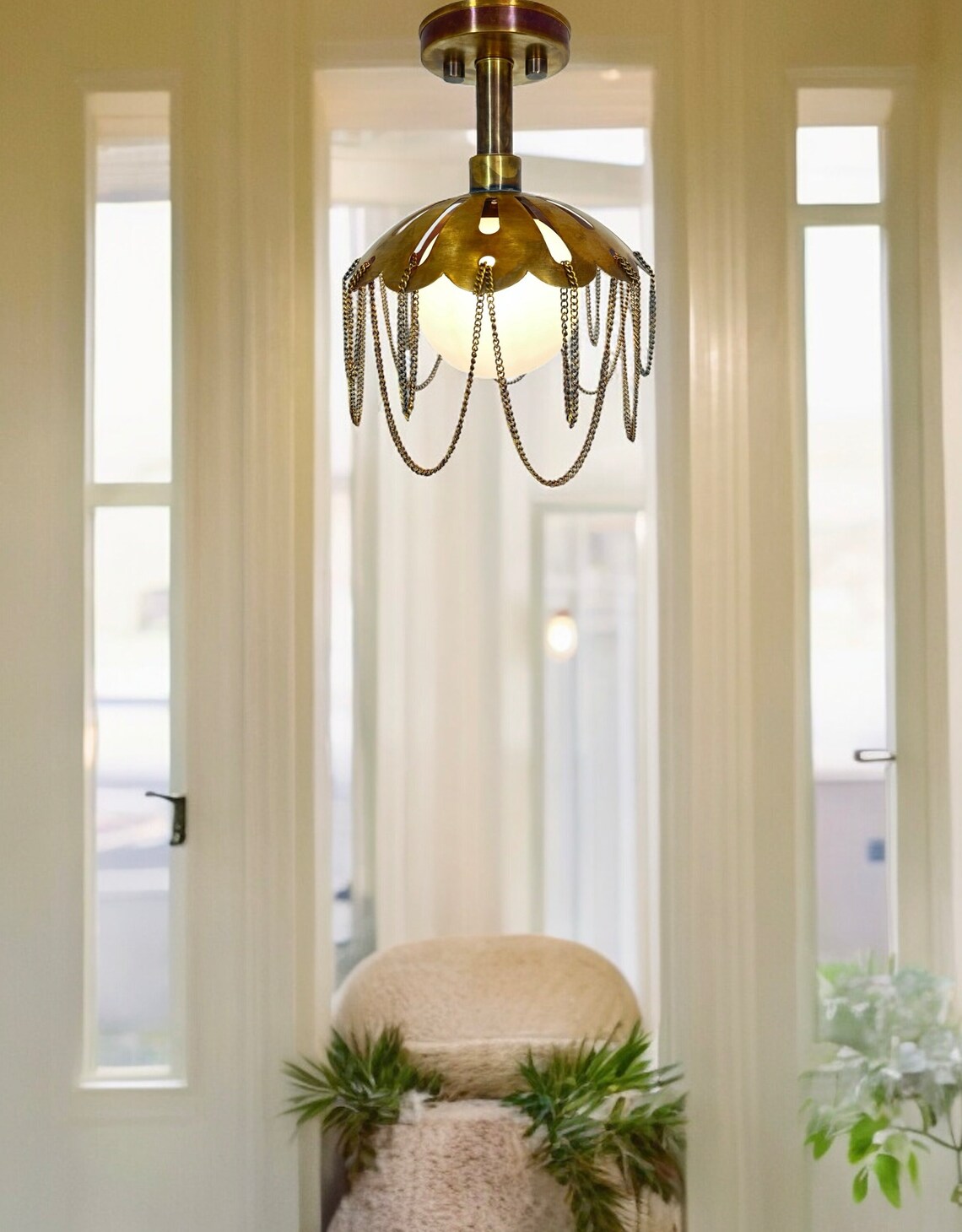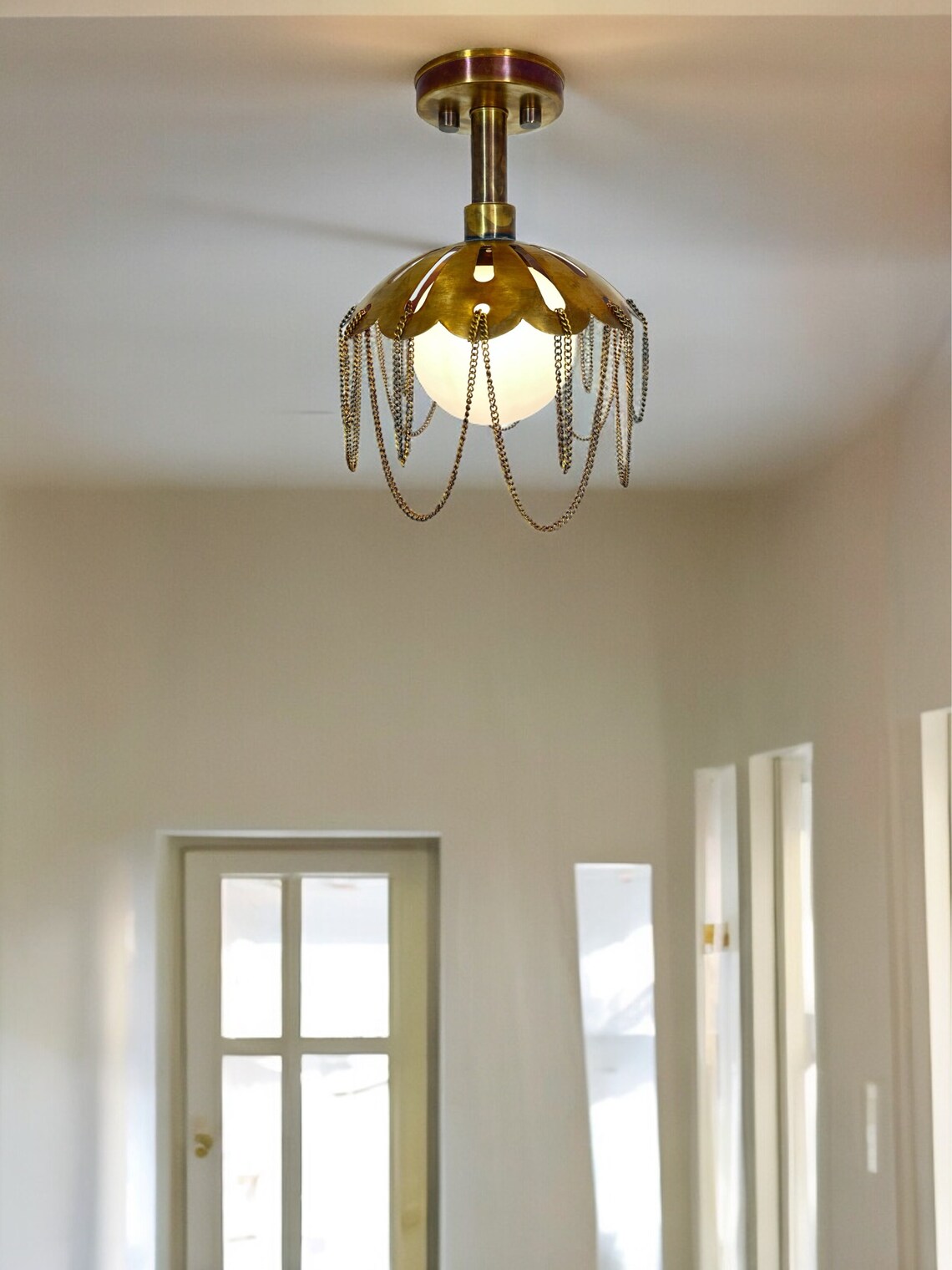 Add a touch of vintage charm to your home with this stunning flower-style pure raw brass flush mount. Handmade with intricate detailing and an antique polish, this fixture exudes elegance and sophistication. The milk glass shade softens the light, creating a warm and inviting ambiance in any room. Perfect for adding a touch of old-world beauty to your space, this flush mount is sure to be a standout feature in your decor.