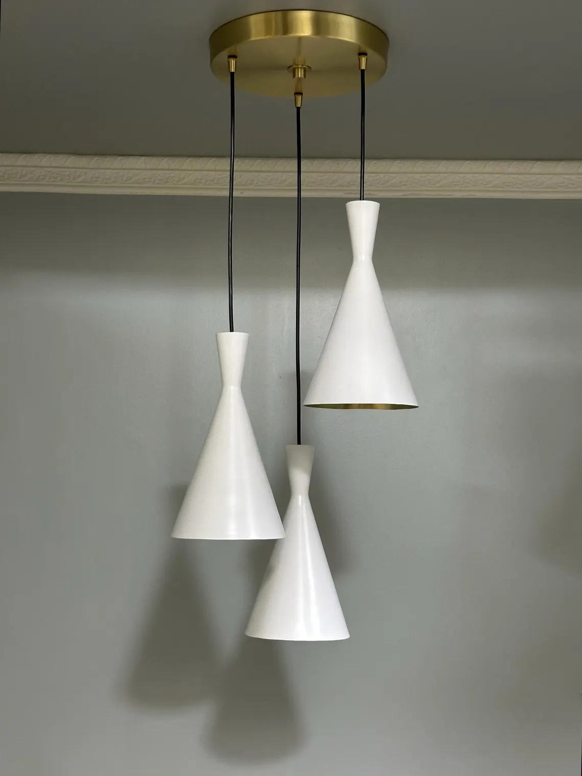 Elevate your space with this stunning handmade brass pendant light fixture, featuring three elegantly tapered cone shades in a sleek matte white finish with a luxurious gold interior. Suspended from a solid brass canopy, this customizable ceiling light blends mid-century modern aesthetics with a contemporary minimalist design.