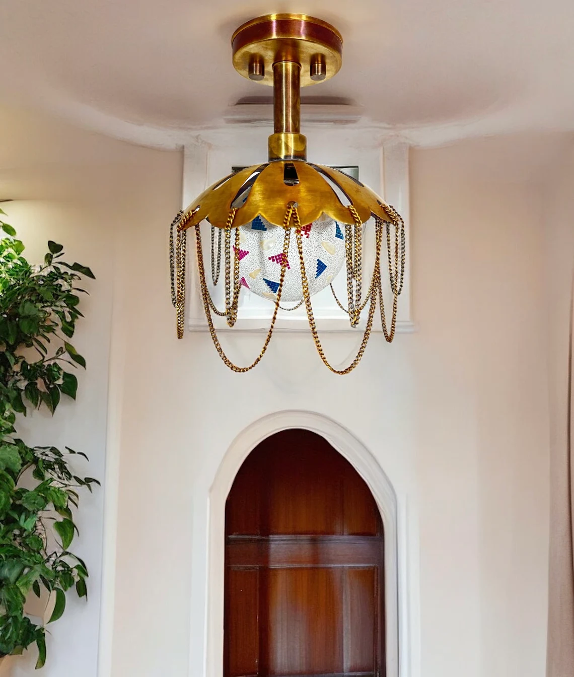 Handmade Brass Flush Mount Light: Multicolor Glass Shade, Antique Finish