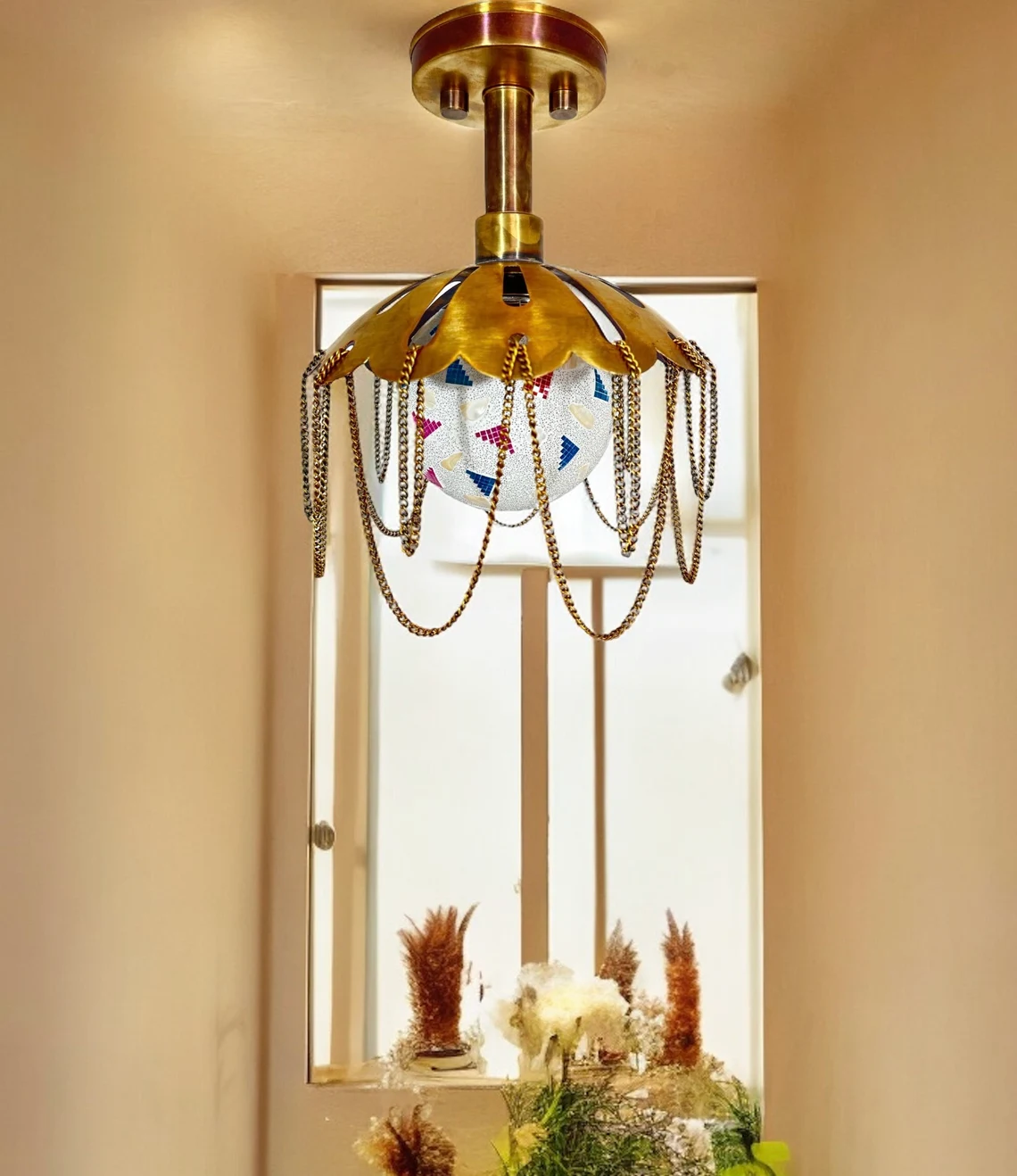 Whether used as a focal point in a living room, bedroom, or hallway, this handmade flush mount ceiling light with its captivating multi-color glass ball promises to elevate your space with charm, style, and enduring beauty.