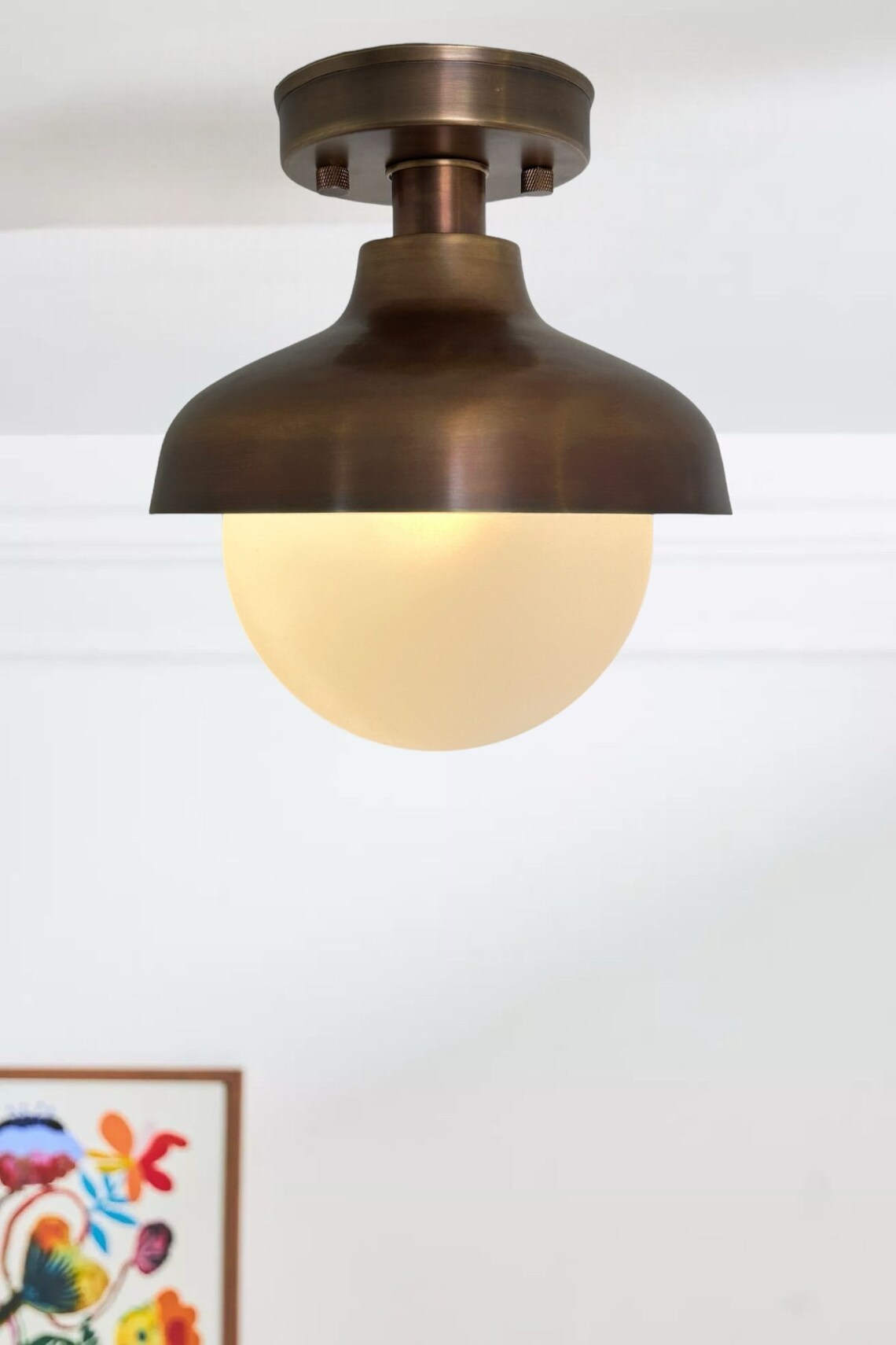 Enhance your space with this exquisite handmade brass semi flush mount featuring an antique finish and a captivating milk glass shade. Elevate your home decor with this unique lighting fixture that adds a touch of vintage charm and sophistication. Add a touch of elegance to any room with this stunning handmade brass semi flush mount. With its antique finish and mesmerizing milk glass shade, this fixture exudes style and grace. Illuminate your space in a warm, inviting glow with this one-of-a-kind lighting piece. Elevate your home lighting with this beautifully crafted handmade brass semi flush mount. The antique finish and delicate milk glass shade combine to create a timeless piece that brings a touch of vintage flair to any space. Brighten up your surroundings with this elegant and stylish fixture.