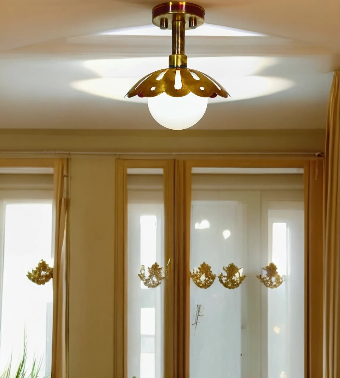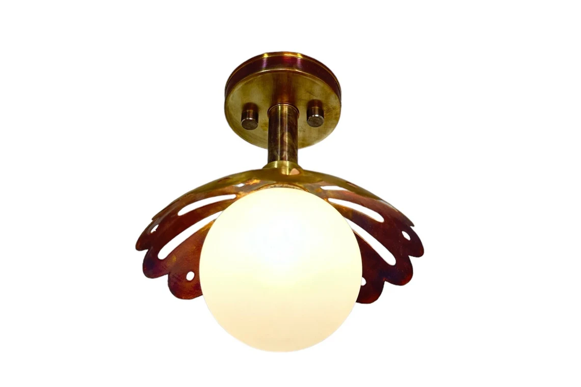 Add a touch of vintage charm to your living space with this stunning flower-style handmade raw brass flush mount light fixture. Featuring a delicate Milk glass shade and an elegant antique brass finish, this ceiling light will illuminate your room with a warm and inviting glow. Perfect for adding a touch of sophistication to any room in your home, this unique fixture is sure to be a conversation piece. Elevate your decor with this beautiful and timeless lighting option today!