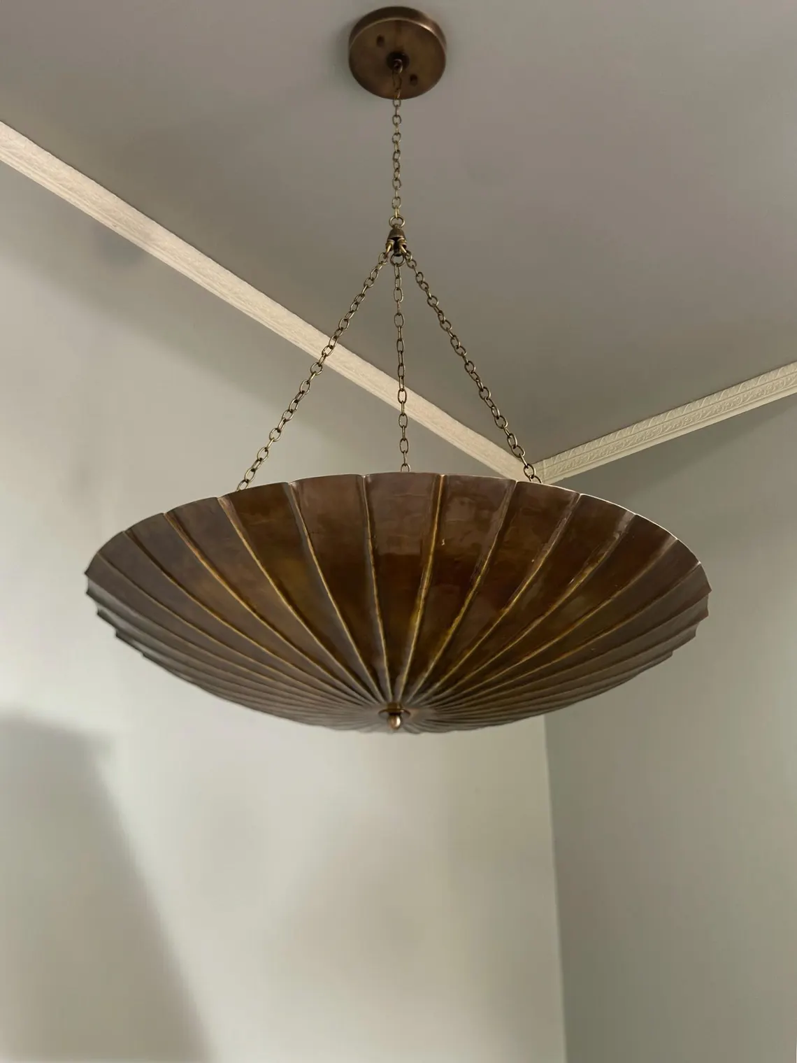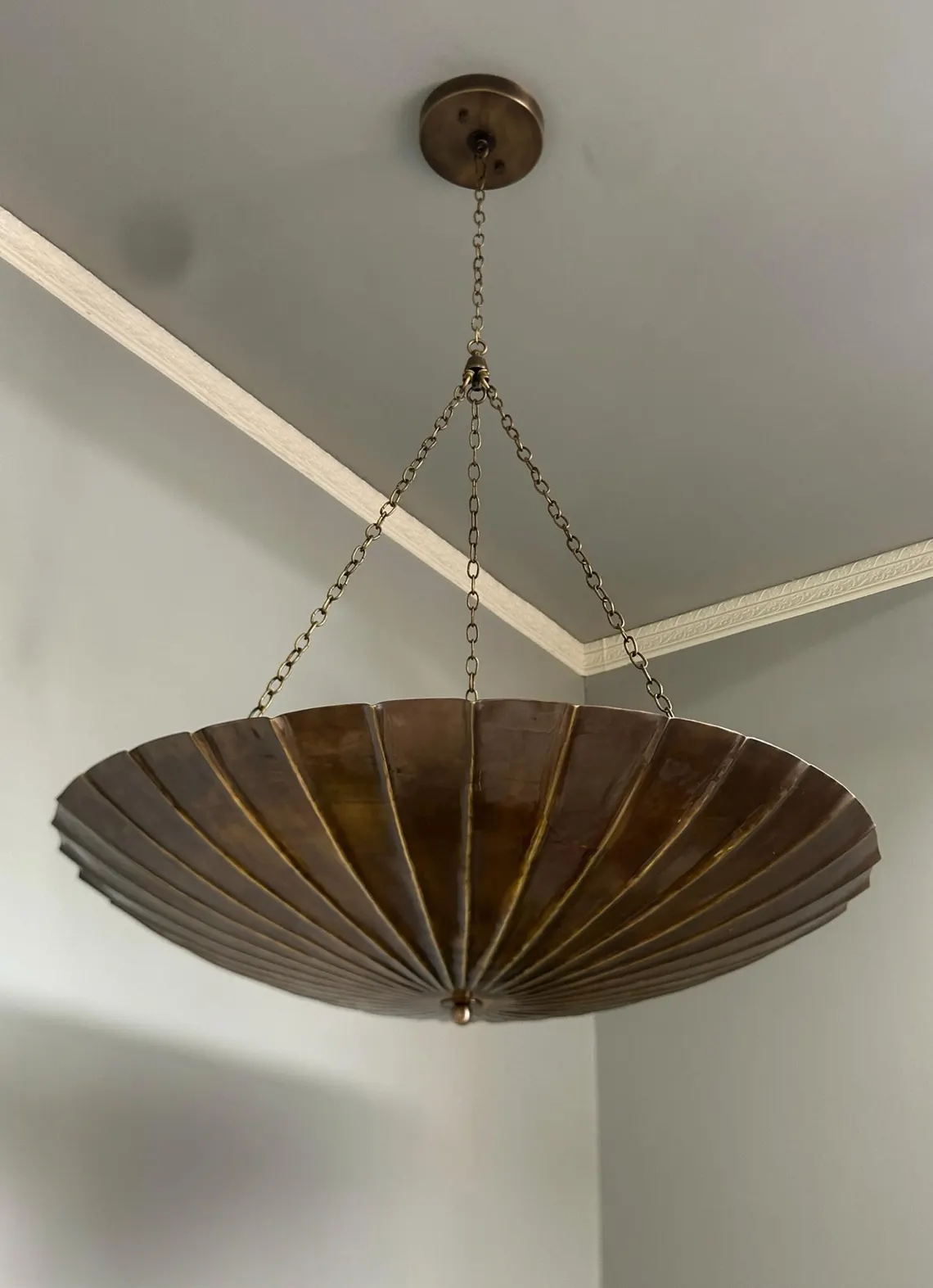 Make a bold statement in your home with this handcrafted brass chandelier pendant light, featuring a stunning scalloped bowl-shaped design suspended by three elegant chains. This sophisticated fixture brings a perfect blend of vintage charm and modern craftsmanship, ideal for high-ceiling spaces like entryways, dining rooms, or living areas.
