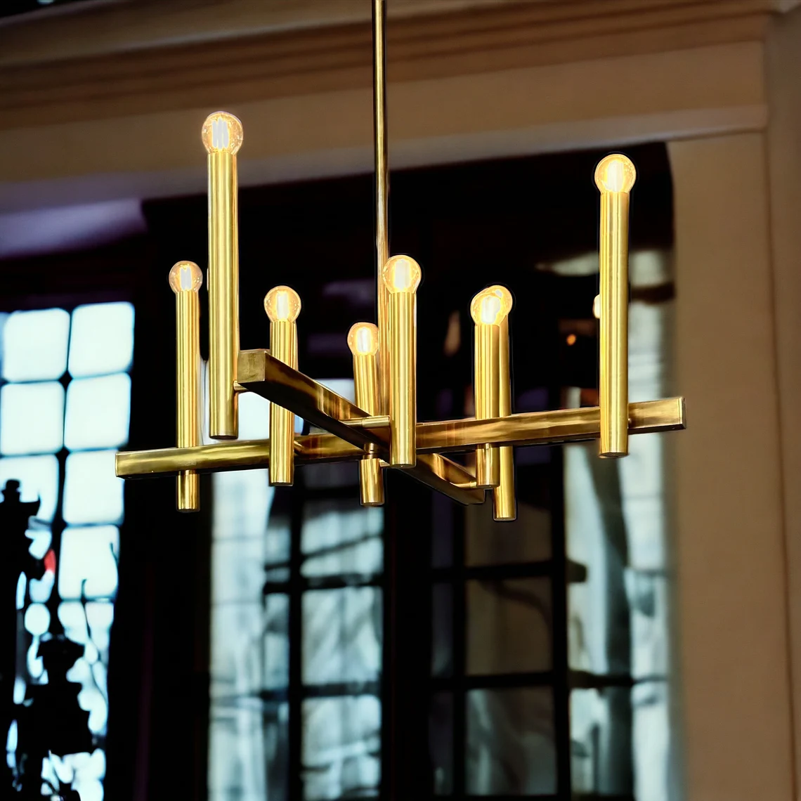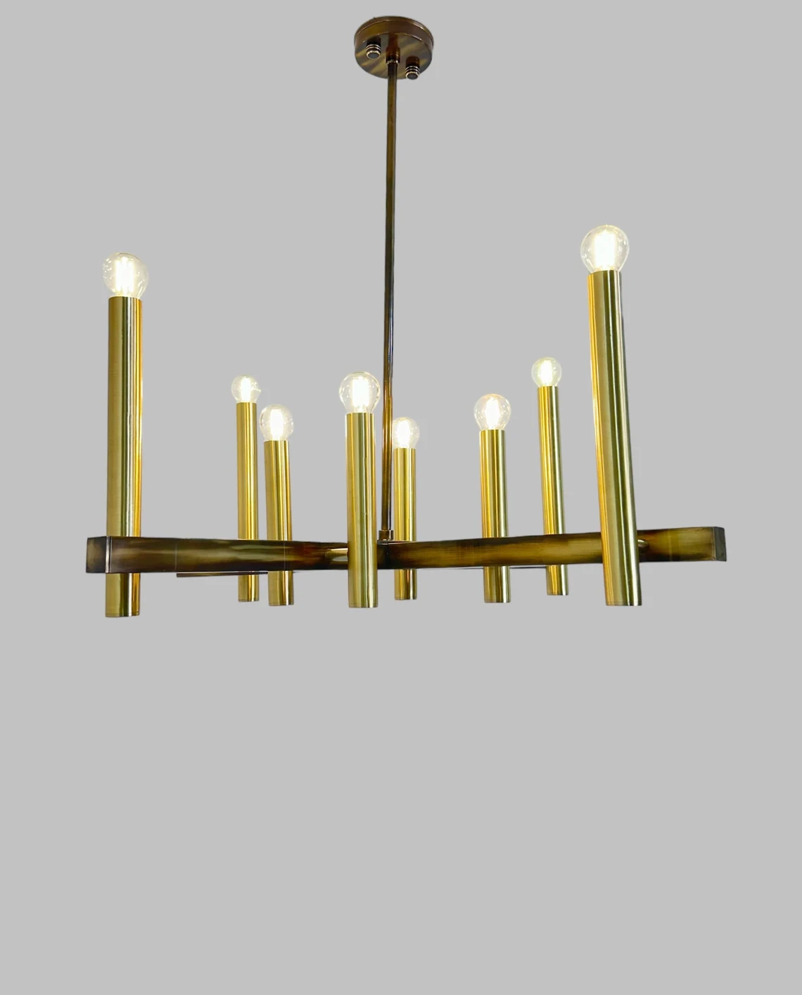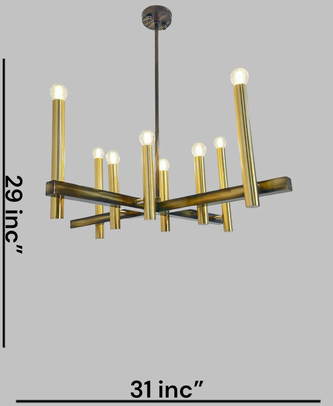 Imagine a striking modern chandelier meticulously crafted by hand, using only pure raw brass. Each piece is carefully shaped and assembled to embody contemporary elegance and artistic craftsmanship. The chandelier’s design blends sleek, minimalist lines with the timeless allure of raw brass.