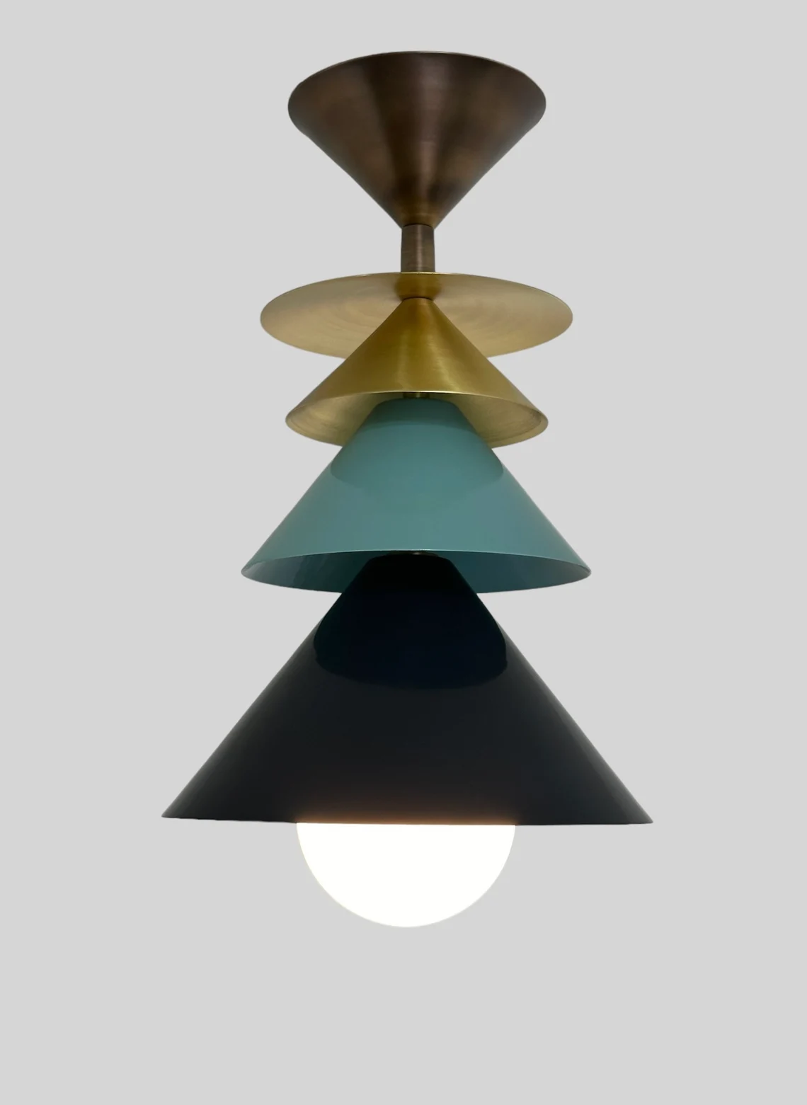 Add a touch of mid-century modern charm to your space with this handmade bell-look flush mount light fixture. Crafted from brass and metal with a milk glass shade, this unique piece will bring a warm and inviting glow to any room in your home. Perfect for adding a vintage flair to your decor, this flush mount combines elegance and functionality for a truly stylish lighting solution. Upgrade your space with this one-of-a-kind statement piece today!