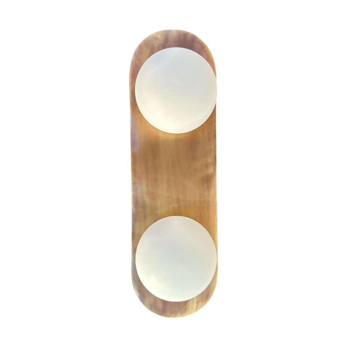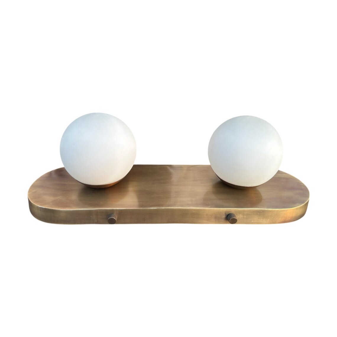Add a touch of timeless elegance to your space with this modern brass vanity sconce. Featuring two frosted glass globes mounted on a beautifully curved brass backplate, this wall light combines mid-century design with contemporary sophistication. Perfect for bathrooms, hallways, bedrooms, or accent walls, this fixture provides soft, ambient lighting that enhances any room.