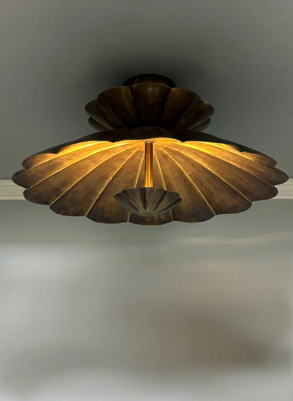 Add a touch of timeless elegance to your space with this vintage-inspired brass flush mount ceiling light. Crafted with a beautiful scalloped, shell-like design, this fixture features a warm antique brass finish that brings sophistication and charm to any room. Its unique layered form makes it a statement piece, ideal for entryways, hallways, powder rooms, or low-ceiling spaces in need of style and character. A perfect blend of Art Deco and coastal aesthetics.