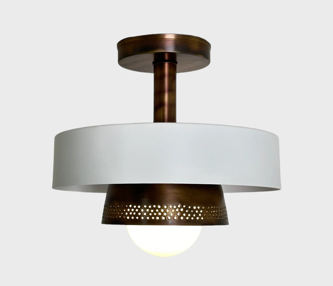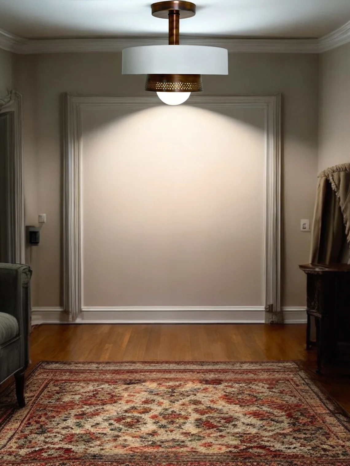 The fixture is designed to sit flush against the ceiling, meaning it doesn’t hang down but rather rests close to the ceiling. This makes it ideal for rooms with lower ceilings or for creating a sleek, streamlined look. The combination of brass and milk glass can evoke a vintage or mid-century modern feel, but it can also be versatile enough to complement various decor styles, from traditional to contemporary.