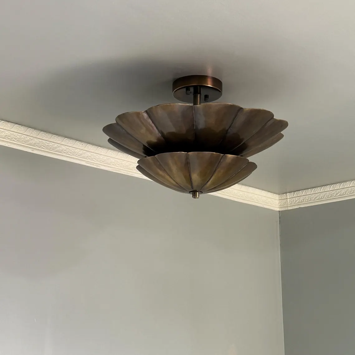 Add timeless elegance to your space with this beautifully crafted brass ceiling flush mount light. Featuring a stunning flower petal-inspired design with a warm, antique finish, this semi-flush mount fixture brings vintage charm and modern sophistication to any room.